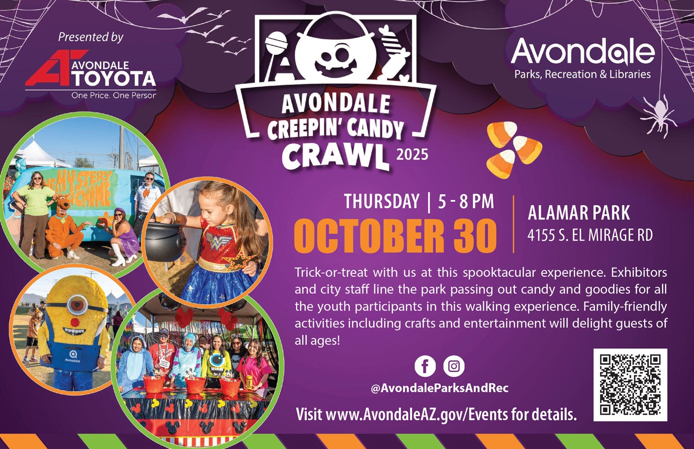 Halloween in Avondale is about to get sweet! Join us Thursday, October 30, from 5–8 PM as Alamar Park transforms into a one-of-a-kind Spooktacular experience for all ages at the Creepin’ Candy Crawl. Get ready for a night of tricks, treats, and fun at this free, family-friendly event—with candy, costumes, and community fun waiting at every turn.